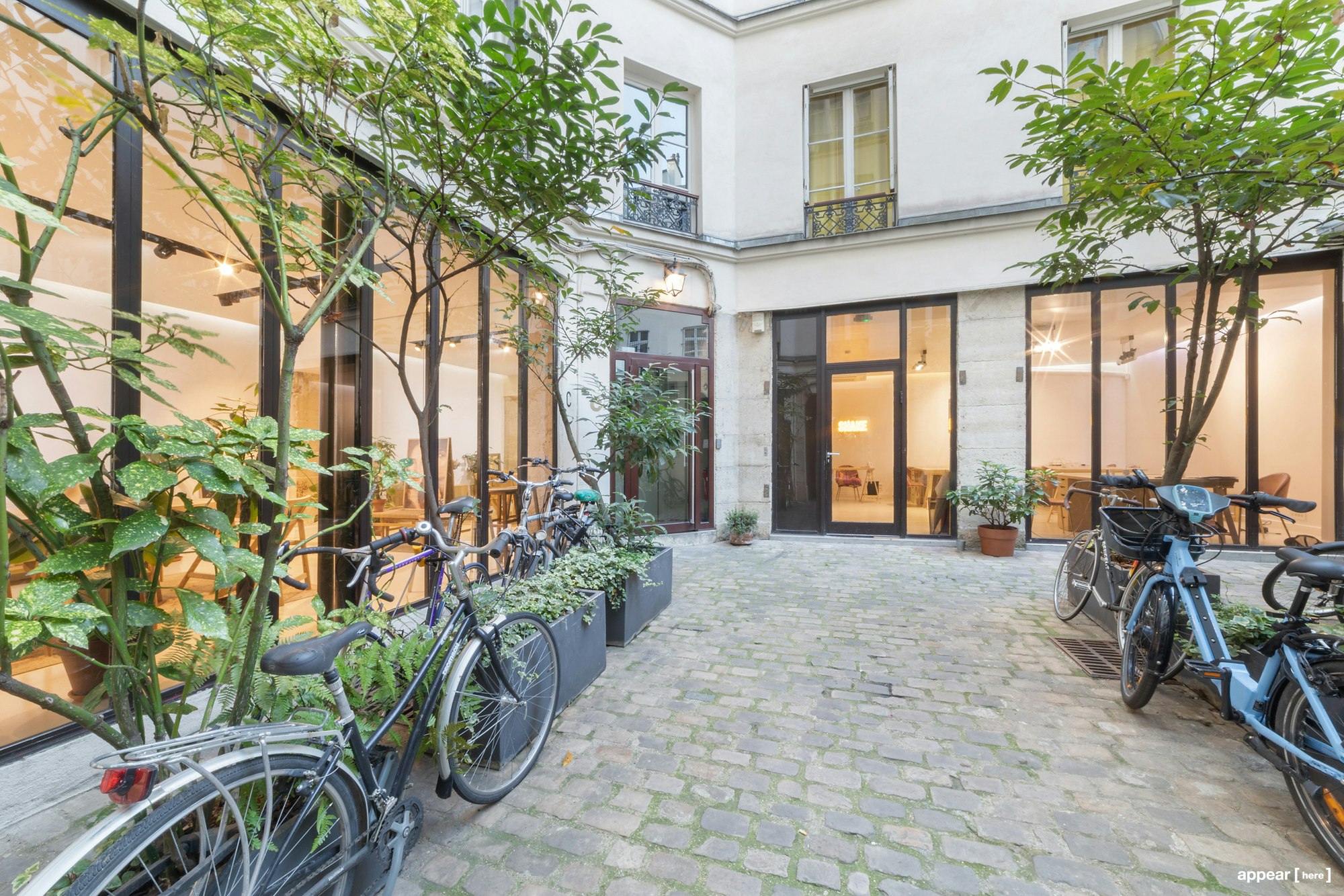 This showroom on the ground floor of a tree-lined interior courtyard is ideally located in the trendy Marais district, behind an elegant carriage gate. The space is perfect for organizing a private showroom, with its white walls that create a very contemporary refined atmosphere.