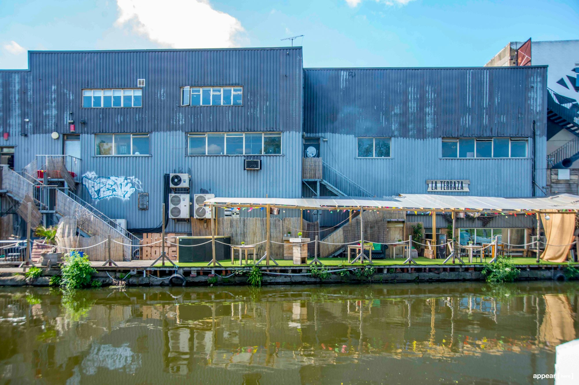 This large former warehouse to rent is an ideal location for an events space. Found next to a bustling canal in north London’s artistic Hackney Wick neighbourhood, the space includes a roomy, high-ceilinged interior, a front-of-house outdoor area, a waterside terrace and a small side room that could be used as an office or a reception. The space also benefits from on-site car parking facilities, and the option for catering. The facade features a large and striking mural of a child’s face, which is in keeping with the creative tone of the local area. The space has hosted a variety of events, including concerts, art exhibitions and installations, and large dinners, such as for wedding receptions. At over 3,000m2, the space has capacity for around 160 people seated or around 550 standing.