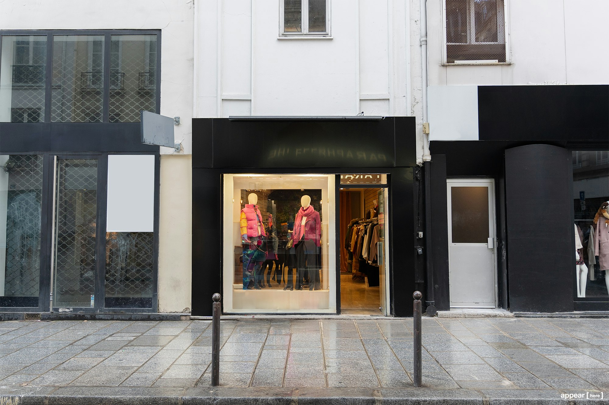 This street level retail space has a wonderful shop front exterior and modern interior decor. Located in the heart of Rue Saint-Denis in Paris, it features white walls and a clean, minimalist aesthetic. The unit includes essential retail elements like lighting, shelves, counters, and fitting rooms. With heating available as well, it is perfectly suited for any type of brand activation pop-up.